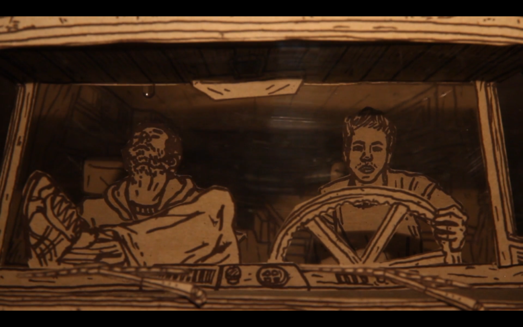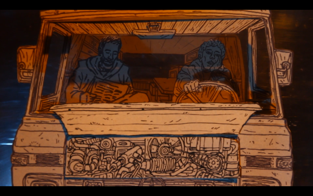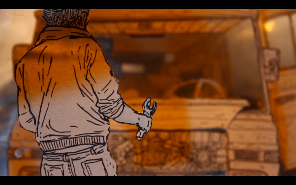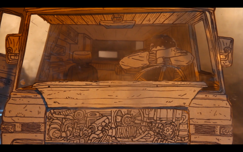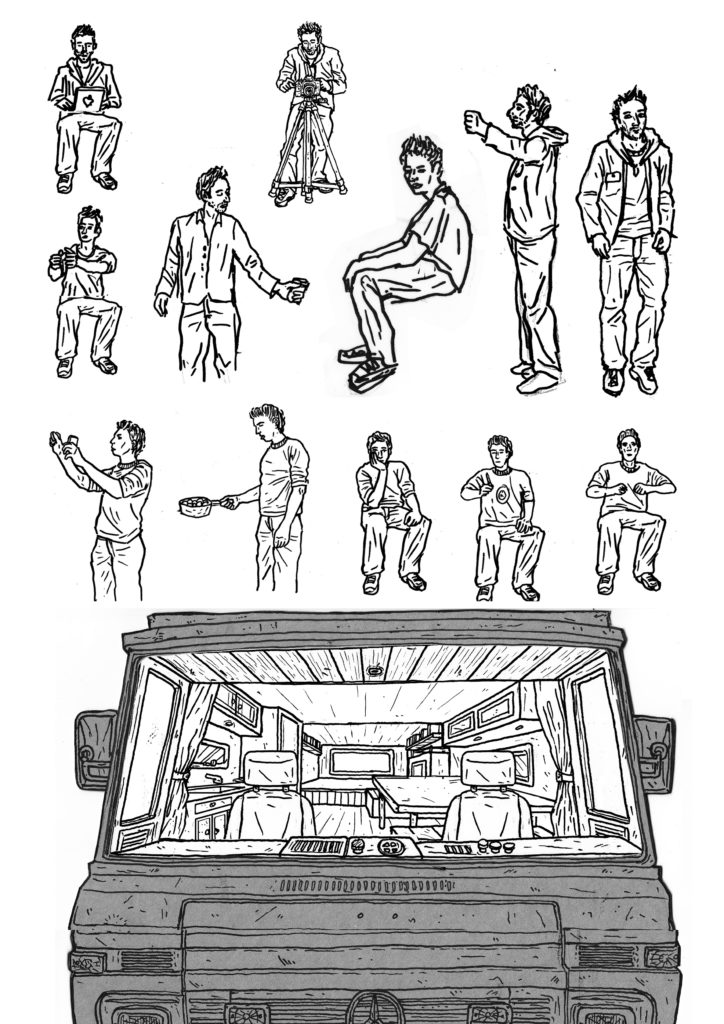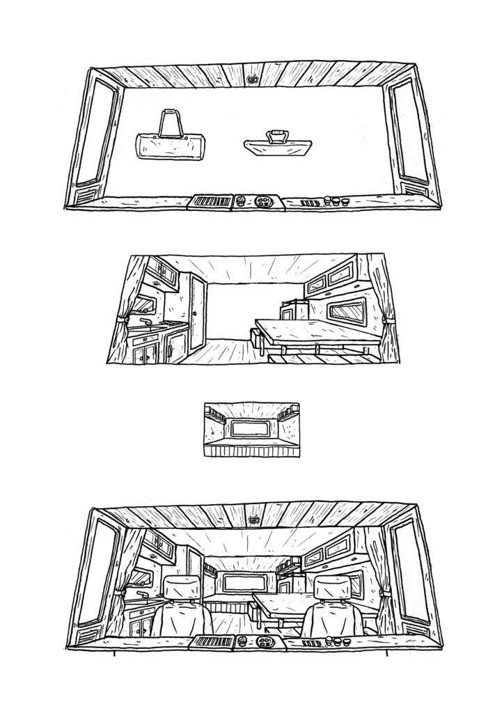 1) Tout d’abord, réaliser un dessin pensé pour être « découpé en tranches ». Dans le cas du camion pour C’est assez bien d’être fou, il y a : le pare-chocs, puis le tableau de bord, puis les sièges, la cuisine, le lit…