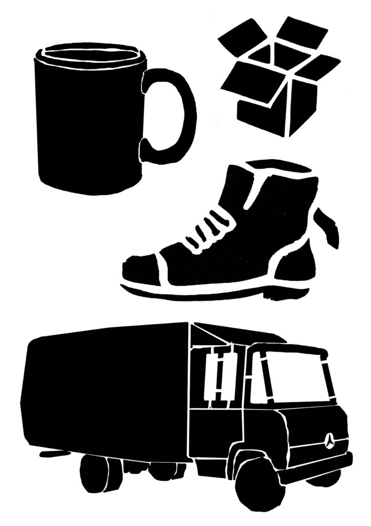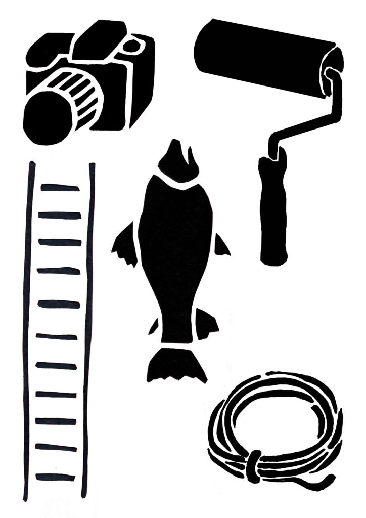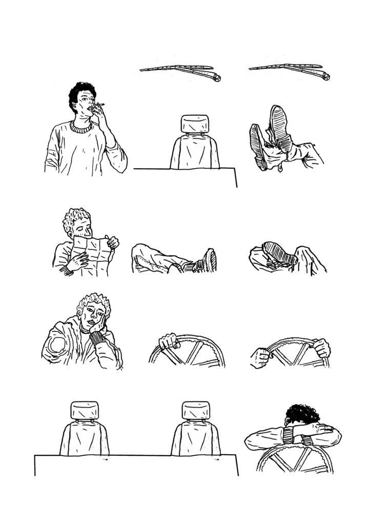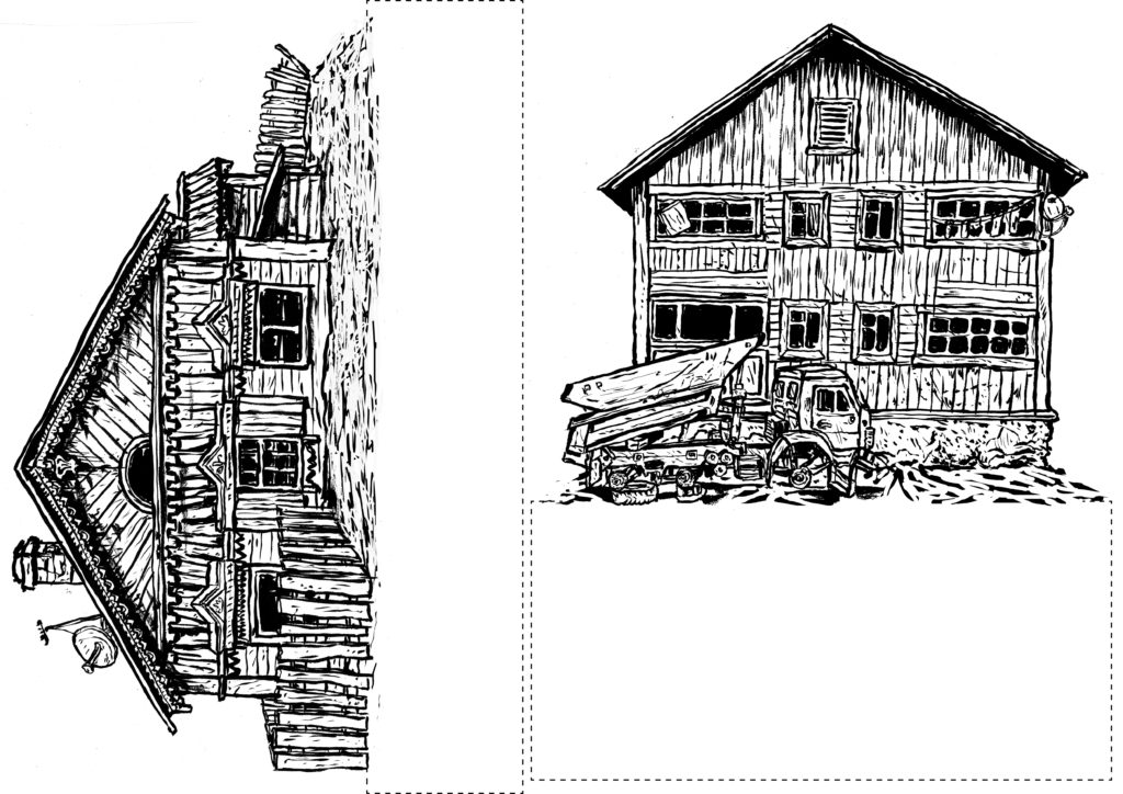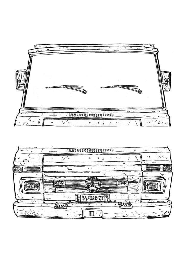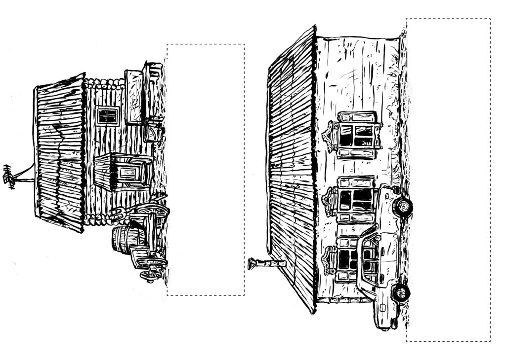 1) Tout d’abord, réaliser un dessin pensé pour être « découpé en tranches ». Dans le cas du camion pour C’est assez bien d’être fou, il y a : le pare-chocs, puis le tableau de bord, puis les sièges, la cuisine, le lit…