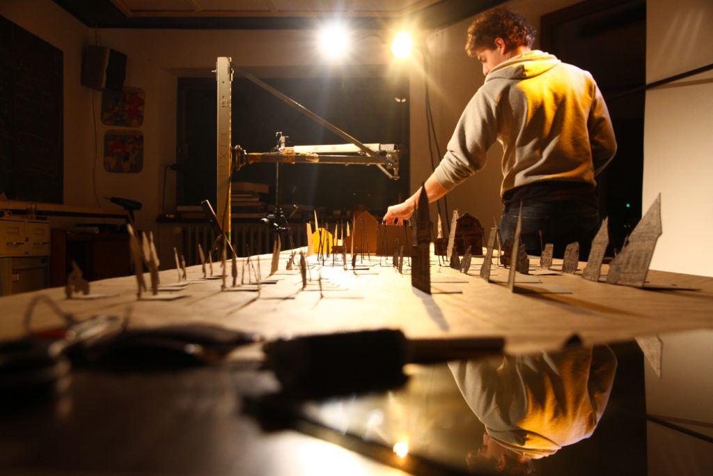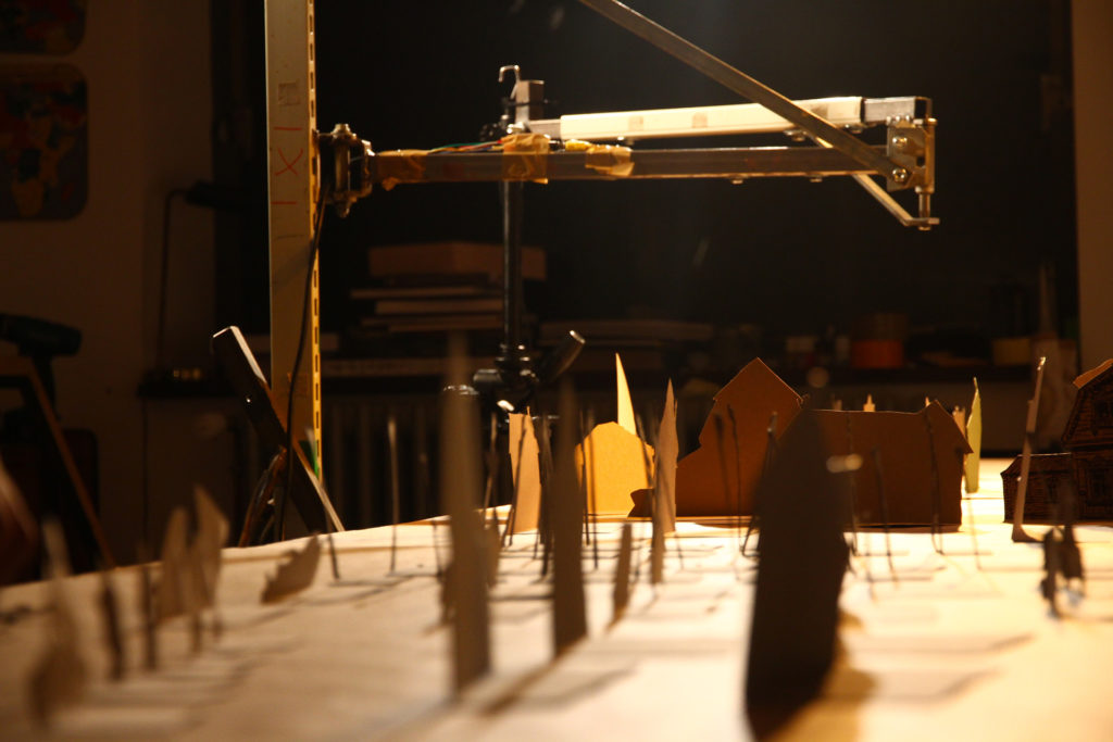 Préparation du village en maquette. Disposition des personnages et des maisons découpées pour recréer un village. La camera suspendue à un bras articulé se déplace en un mouvement de travelling latéral le long de la maquette du village.