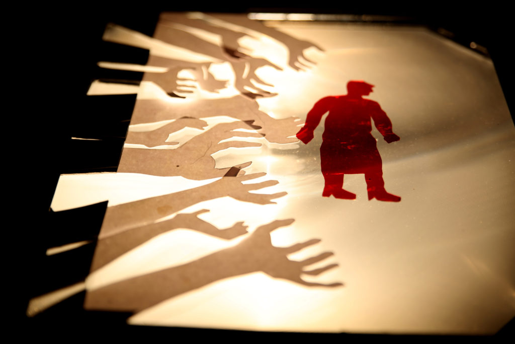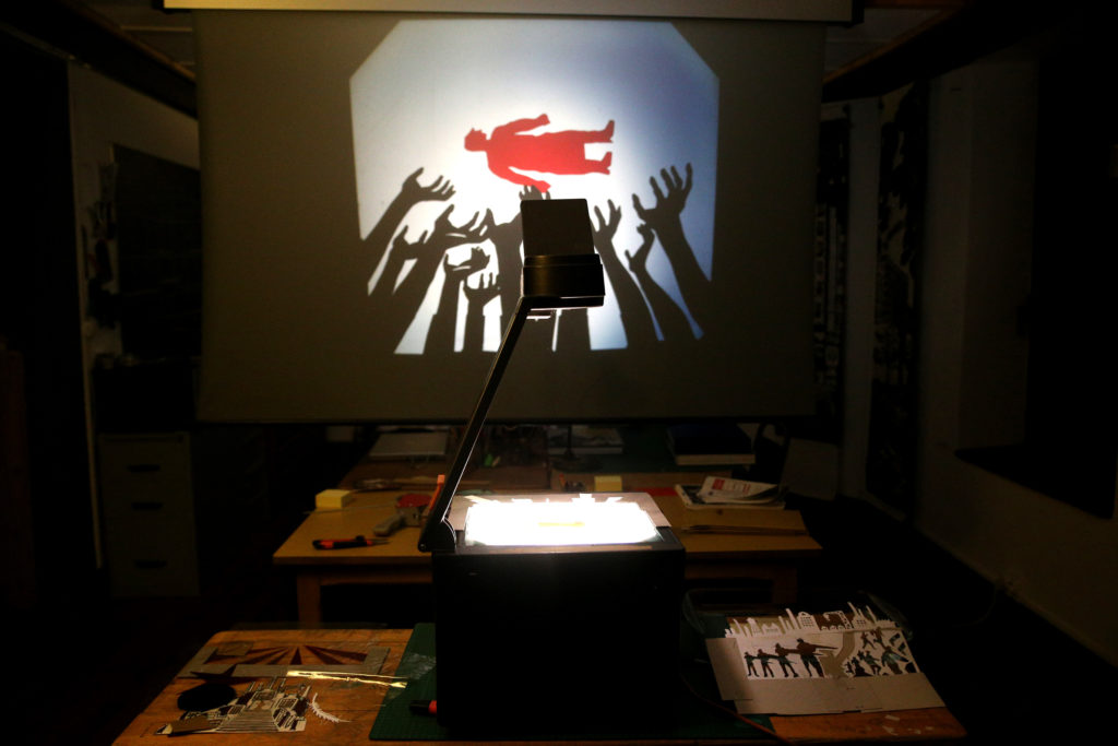 4) Disposer ensuite les formes à plat sur un rétroprojecteur : l’image apparaît verticalement sur un mur ou un écran. Jouer maintenant à narrer l’histoire en déplaçant ou en ajoutant les différents éléments.