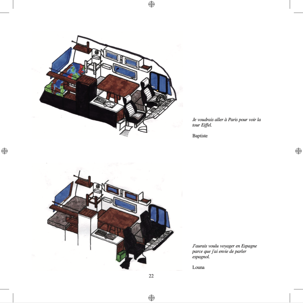 – des voyages et destinations rêvés, très loin ou tout près, au volant du camion d’Antoine et Bilal, d’ailleurs relooké pour l’occasion : car c’est bien beau de « crobarder » sur la route, mais on en oublie de colorier son dessin !