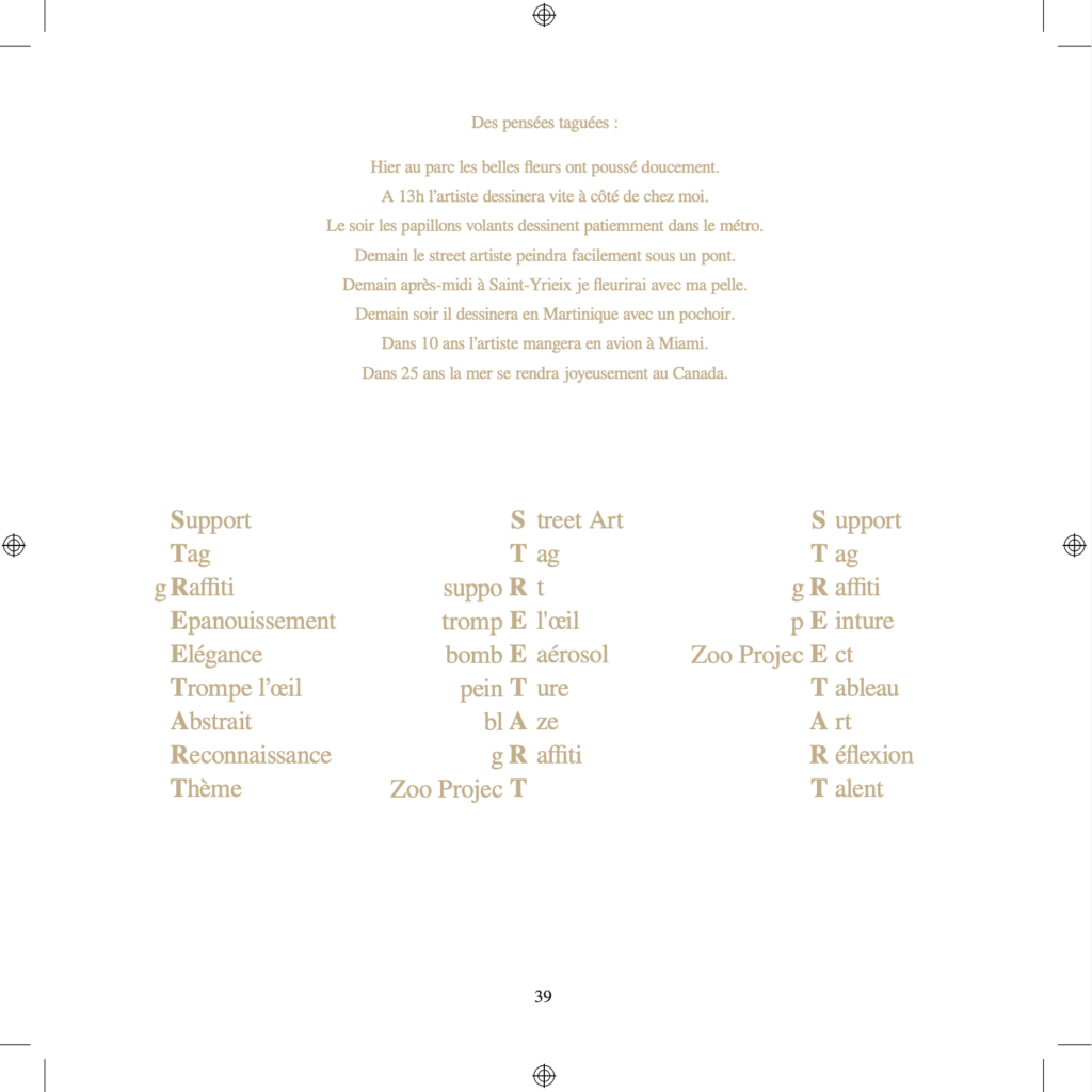 Ensuite, chacun a pris la route… dans plein de directions. Pas d’itinéraire préétabli, au diable le GPS ! Le seul viatique était le travail de Zoo Project découvert dans le film, mais aussi et plus généralement, le street art et les cultures urbaines. Du cours moyen et de la 6ème au CAP, de la 3ème au bac pro, les élèves ont donc lu, dessiné, créé des maquettes, gravé, découpé, tagué, imaginé, cuisiné, bombé, colorié, mais aussi… écrit.