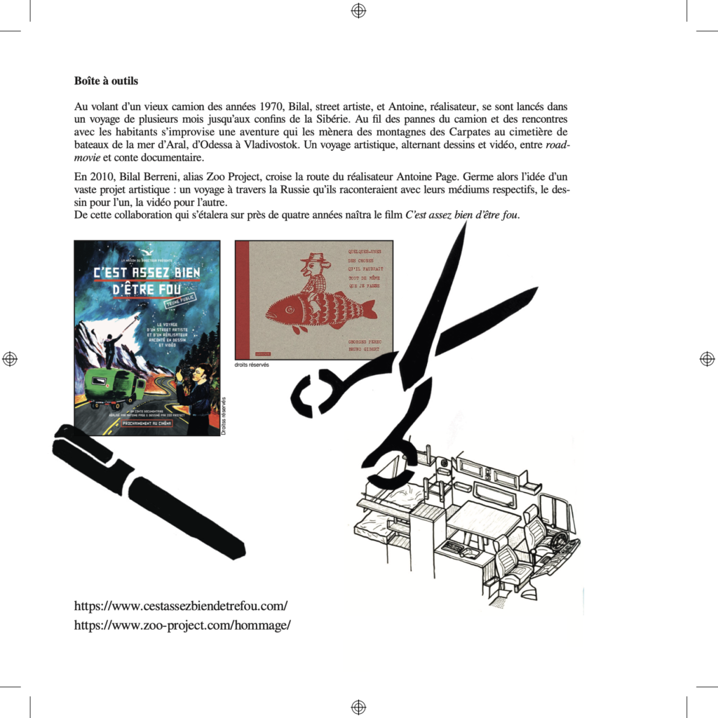 La balade a commencé en novembre, au cinéma Arévi, où les élèves ont vu le très beau film documentaire d’Antoine Page, C’est assez bien d’être fou. On devrait d’ailleurs plutôt dire les films, puisque « les plus petits » ont vu la version jeune public, qui chemine sur la voie du conte, tandis que « les plus grands » ont vu la ver‐ sion tout public : le film est un road-movie où l’on suit, au volant d’un vieux camion tout brinquebalant, Bilal Berreni, alias Zoo Project, street artiste et le réalisateur, lancés dans un voyage de plusieurs mois jusqu’aux confins de la Sibérie. Et à l’issue des projections, les élèves ont aussi eu la chance de rencontrer Antoine Page, venu tout spécialement du Jura pour leur présenter son travail et répondre à leurs questions.
